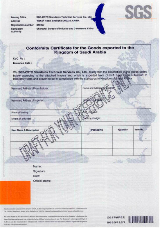 办理流程:申请方提交上述文件,SGS进行文件审核,通过后,SGS提供主要的验货要求,付款,与SGS预约好检验日期,出口商按要求备好货,GS检验员前往货物现场进行检验,合格后,SGS凭客户提交的的Final/Commercial Invoice等最终单据签发COC正本证书,正本由肯尼亚SGS办公室直接签发给进口商CLOSE。