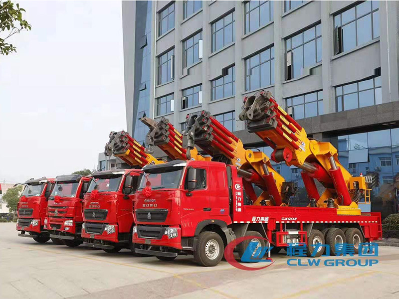 程力威牌大型起重机,程力大型随车起重机批量订单展示 4辆100吨大型起重机,在程力集团办公大厅门前整装待发 100吨大型随车吊 程力威牌大型随车起重机...
