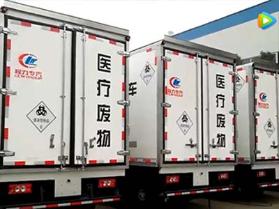 由程力汽车集团特种厢式车专业厂生产的医疗废物运转车整齐排列等等发车,程力专汽一批医疗废物运转车即将发车: 医疗废物运输车出厂!厢体采用外玻...